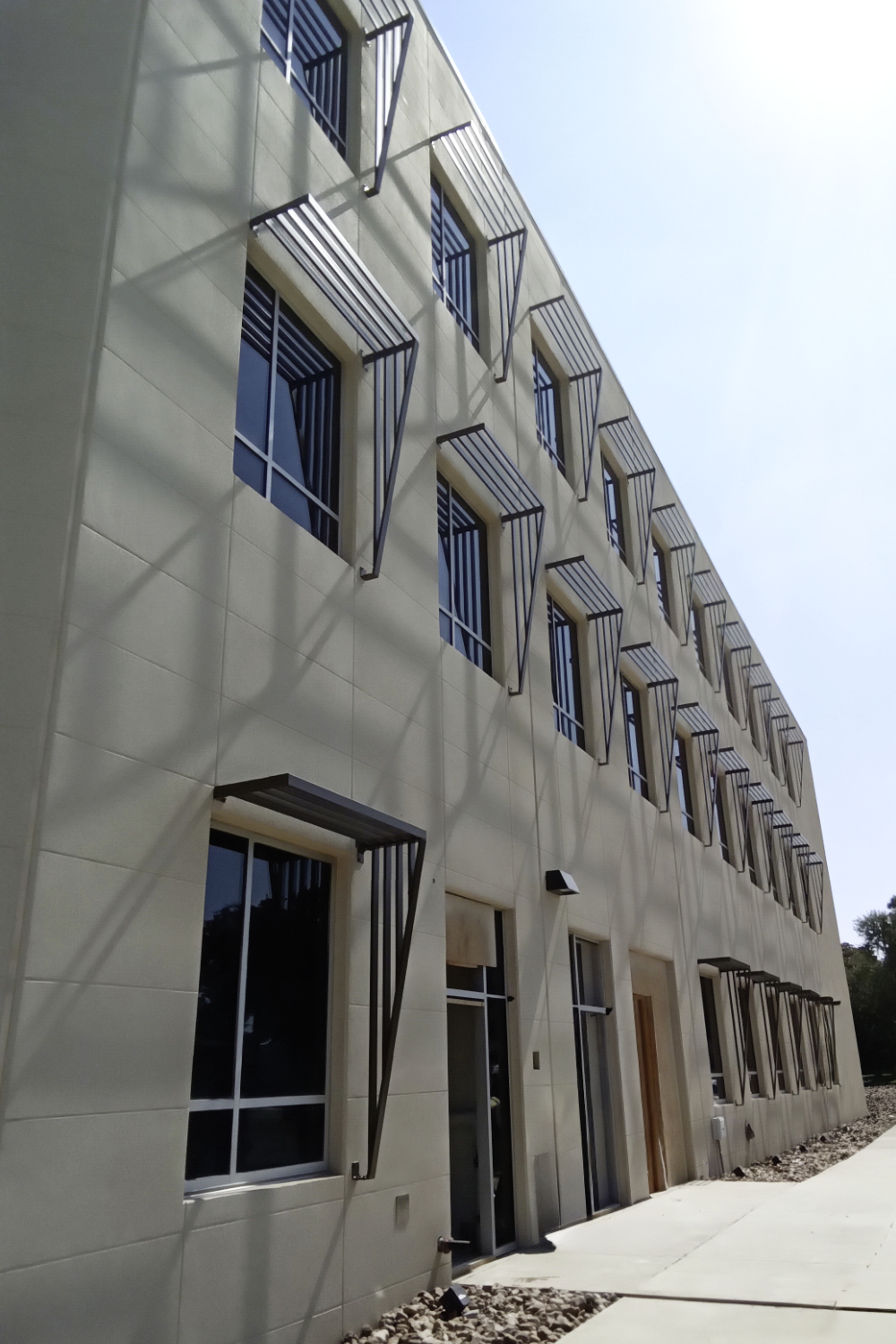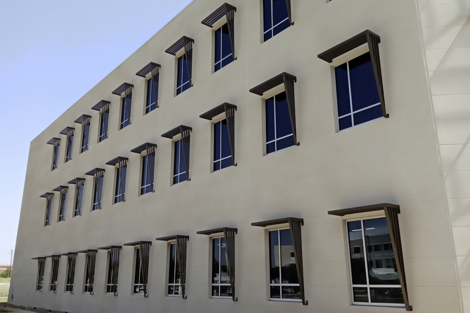 Overall, the sunshade system enhances both function and design, giving the facility a simple and efficient shading solution that blends seamlessly with the building.